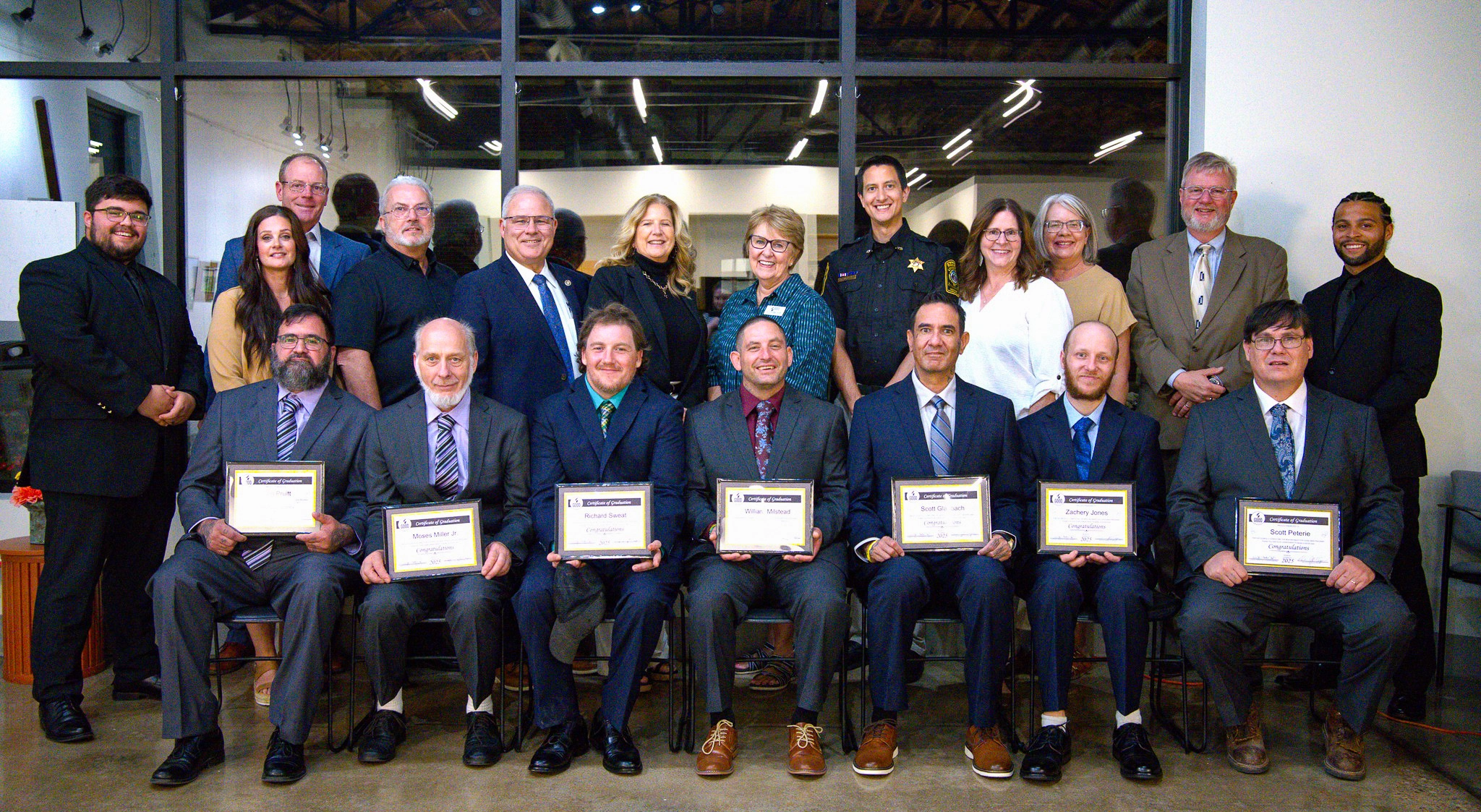 A group of people, members of the Good Dads Chillicothe Advisory Board, stand against a dark background for a group photo.